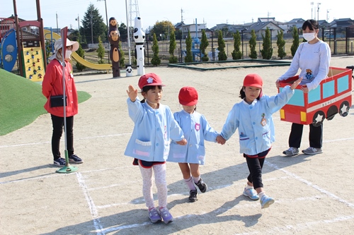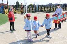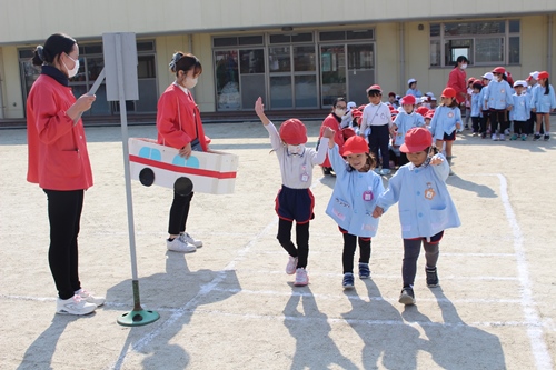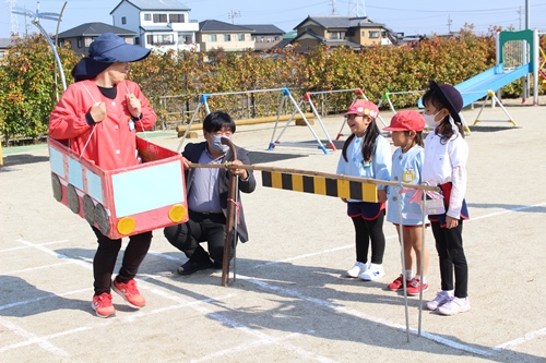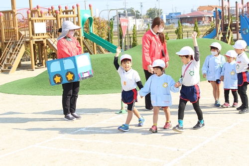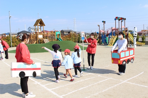 園庭を街に見立て、横断歩道や信号、標識、踏切まで作ってあり、車も走っていて、そこを子どもたちが交通ルールを守って安全に進んでいきます。