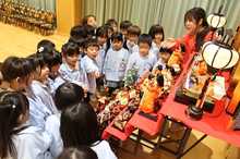 今では珍しくなった7段のひな壇飾りを前に、ひな壇に乗っているお人形の名前や役割などを聞いたり、ひなまつりクイズをしたり、ひなまつりの歌を歌ったりして楽しく過ごしました。
